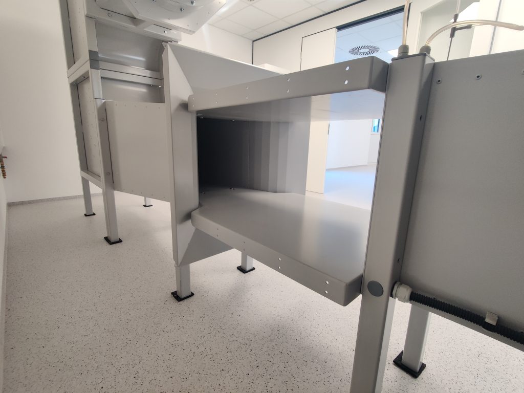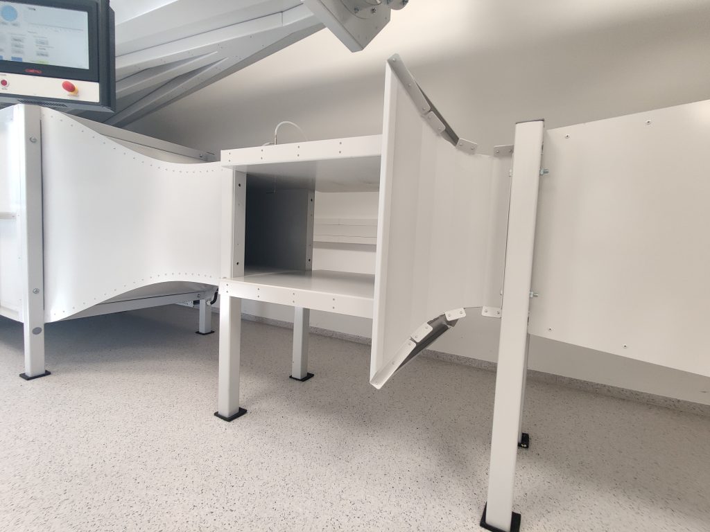 For Systronik, the WT327 wind tunnel was further developed and built in Revision C. The wind tunnel is characterized by its low installation height, divisible corners, and a semi-open test section with an easily accessible working area.